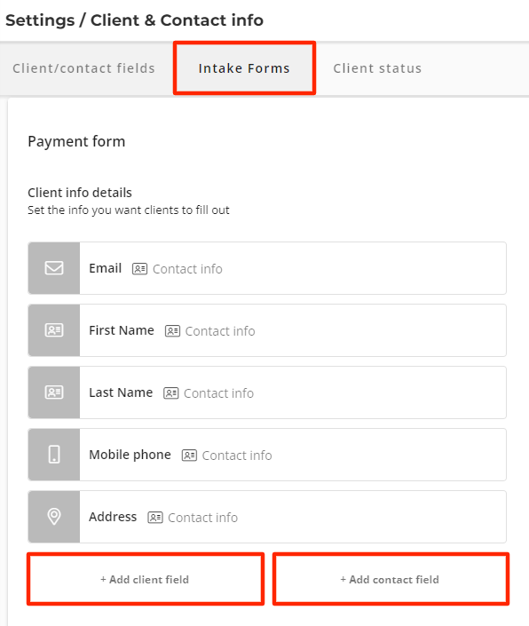 - Optional: To add personal details, click Add Client Field. To add business-related items, Click Add Contact.