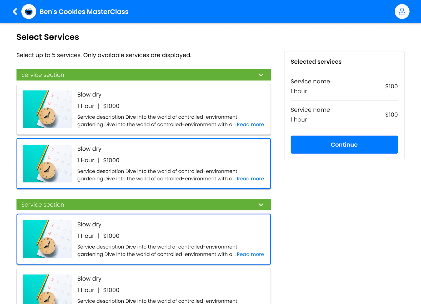 Events cannot be booked together with services. If an event is selected for a visit, it will automatically be disabled if you try to add a service and vice versa. This is because events are one-time experiences and don’t work with regular service bookings. We recommend adding a note or an asterisk to explain that events must be booked separately from services.