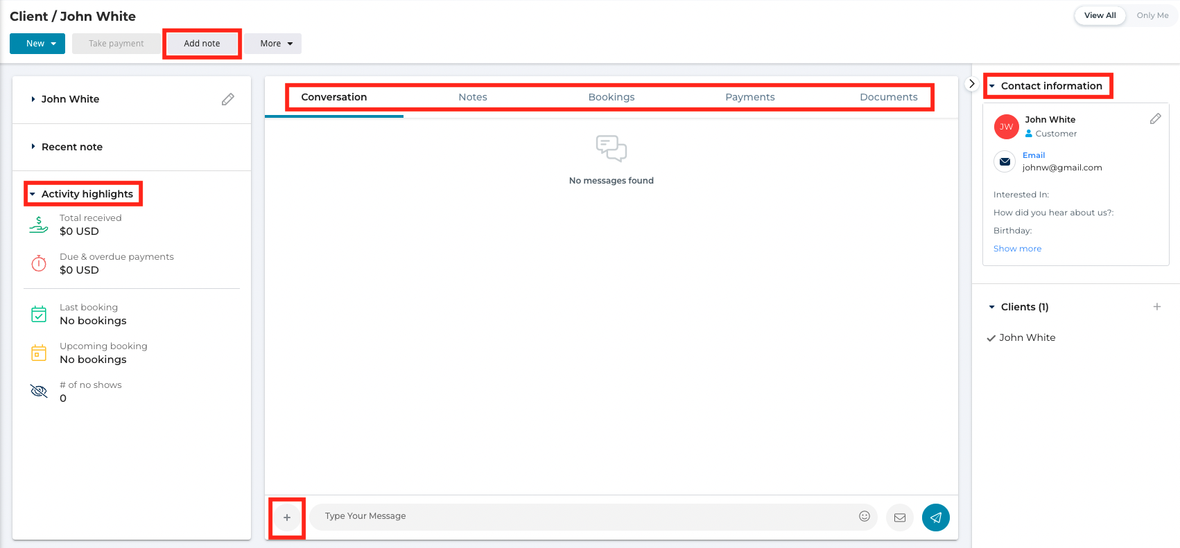 The contact/client card will open. You'll see tabs for contact details, activity highlights, conversations, notes, bookings, payments, and documents.
