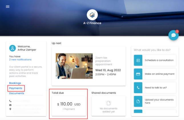 From the "Total Due" or "Payments" menus, clients can also view their outstanding payments and payment history via the Client Portal.